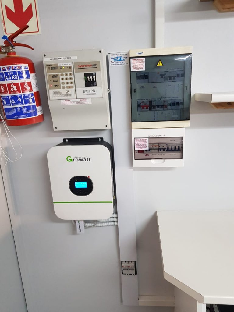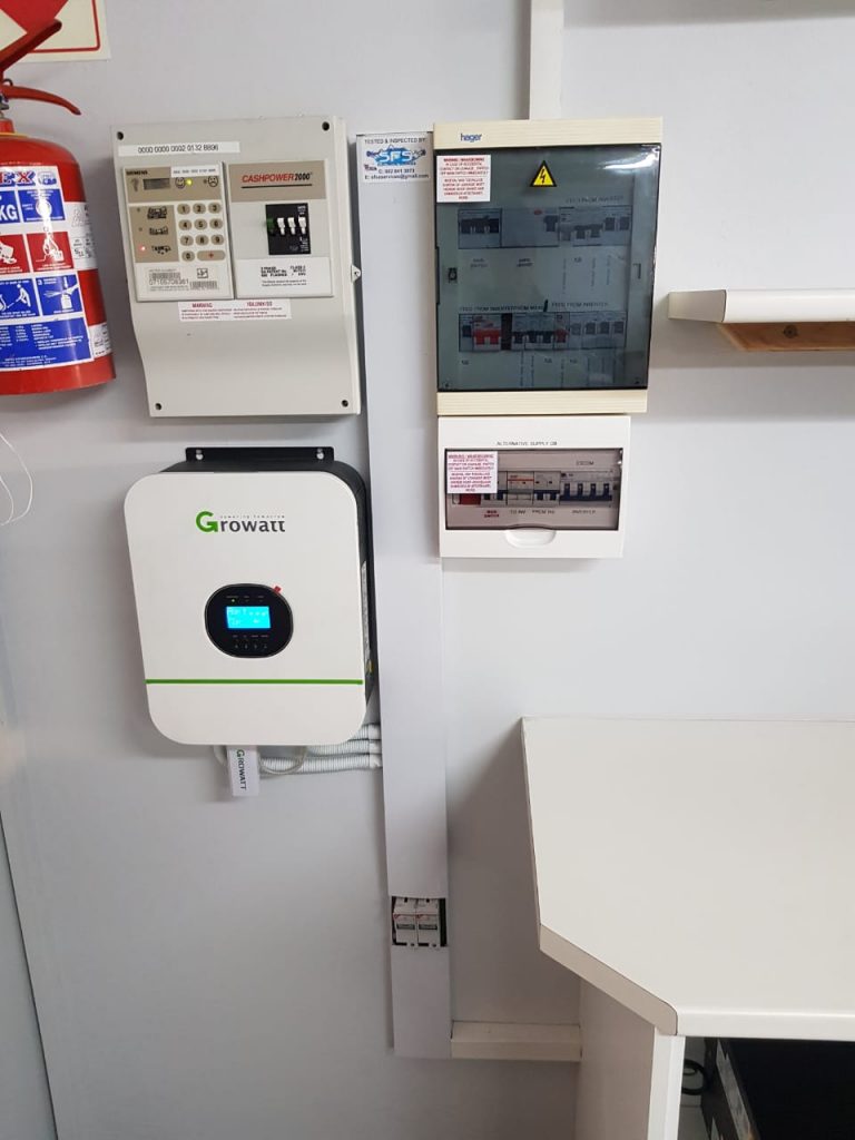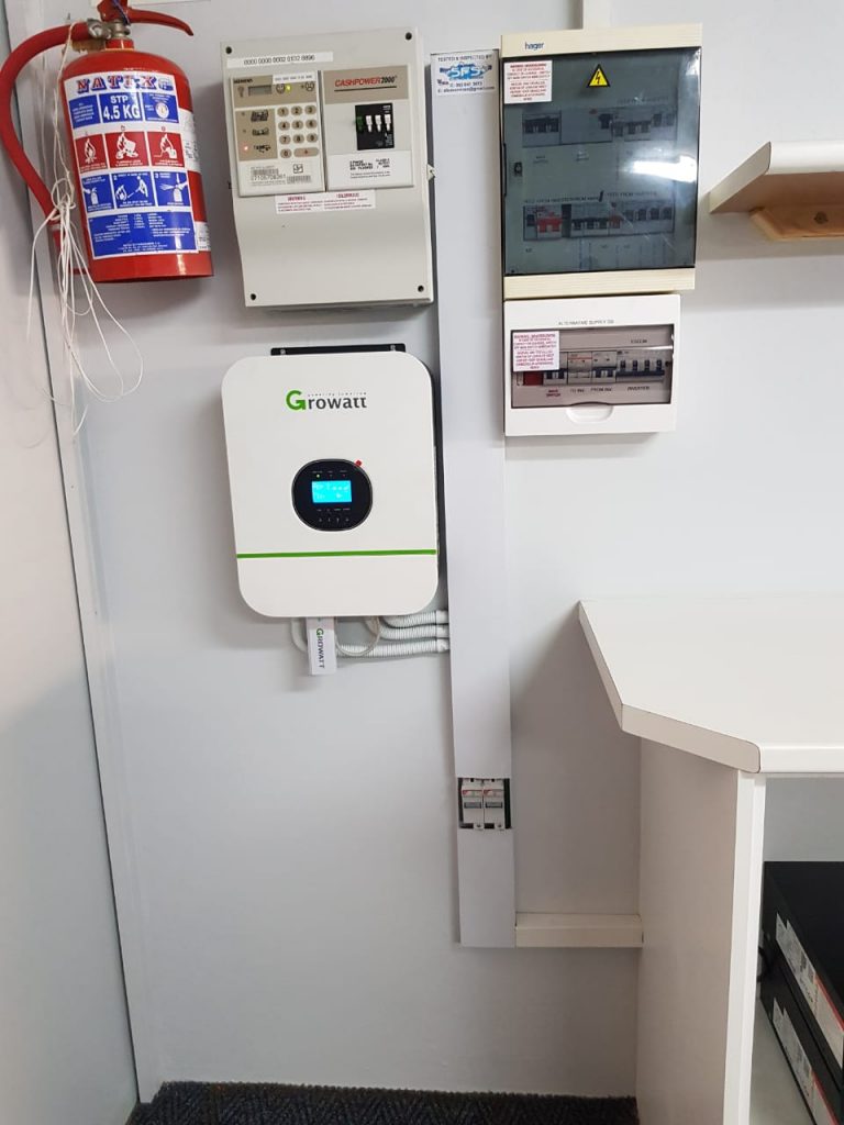 Growatt with 2 x polyntech batteries installed for Odyssey point of sale office in Cape town.
